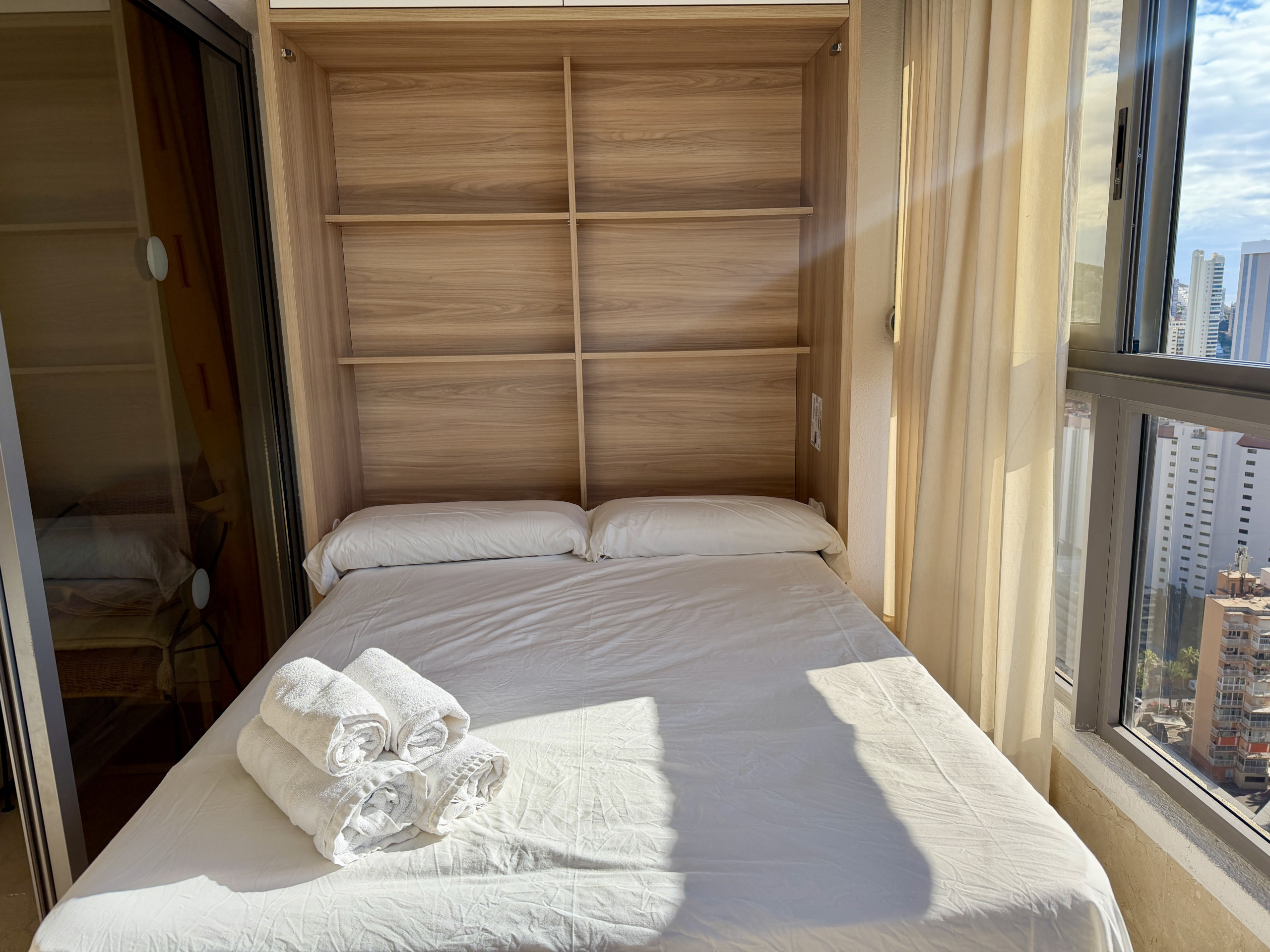 Está ubicado en una de las principales avenidas de Benidorm, a solo 2 minutos a pie de la playa. Este elegante apartamento de un dormitorio cuenta con dos camas individuales y un salón con sofá cama y aire acondicionado.