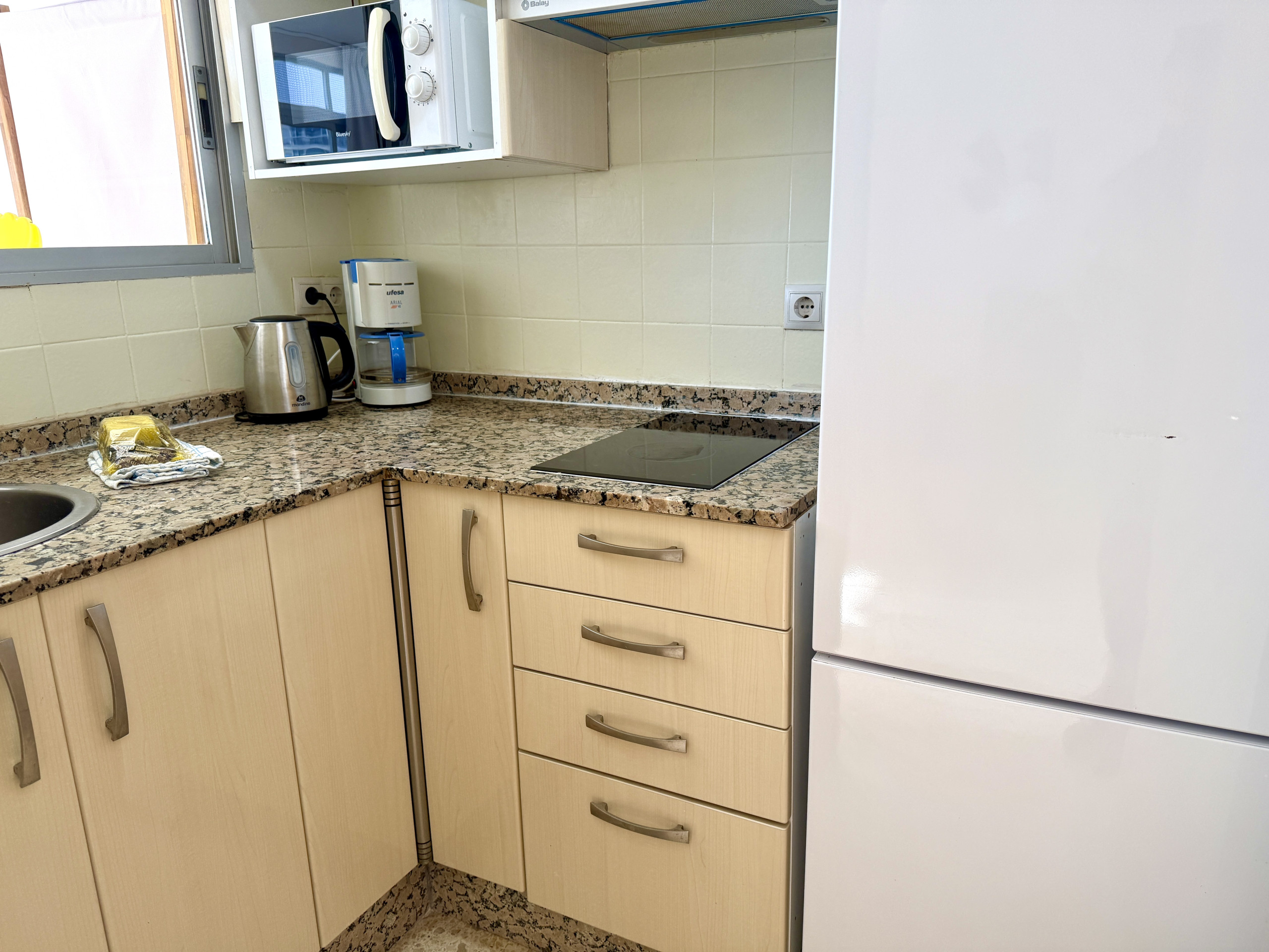 La cocina está equipada con horno, microondas, nevera y lavadora.