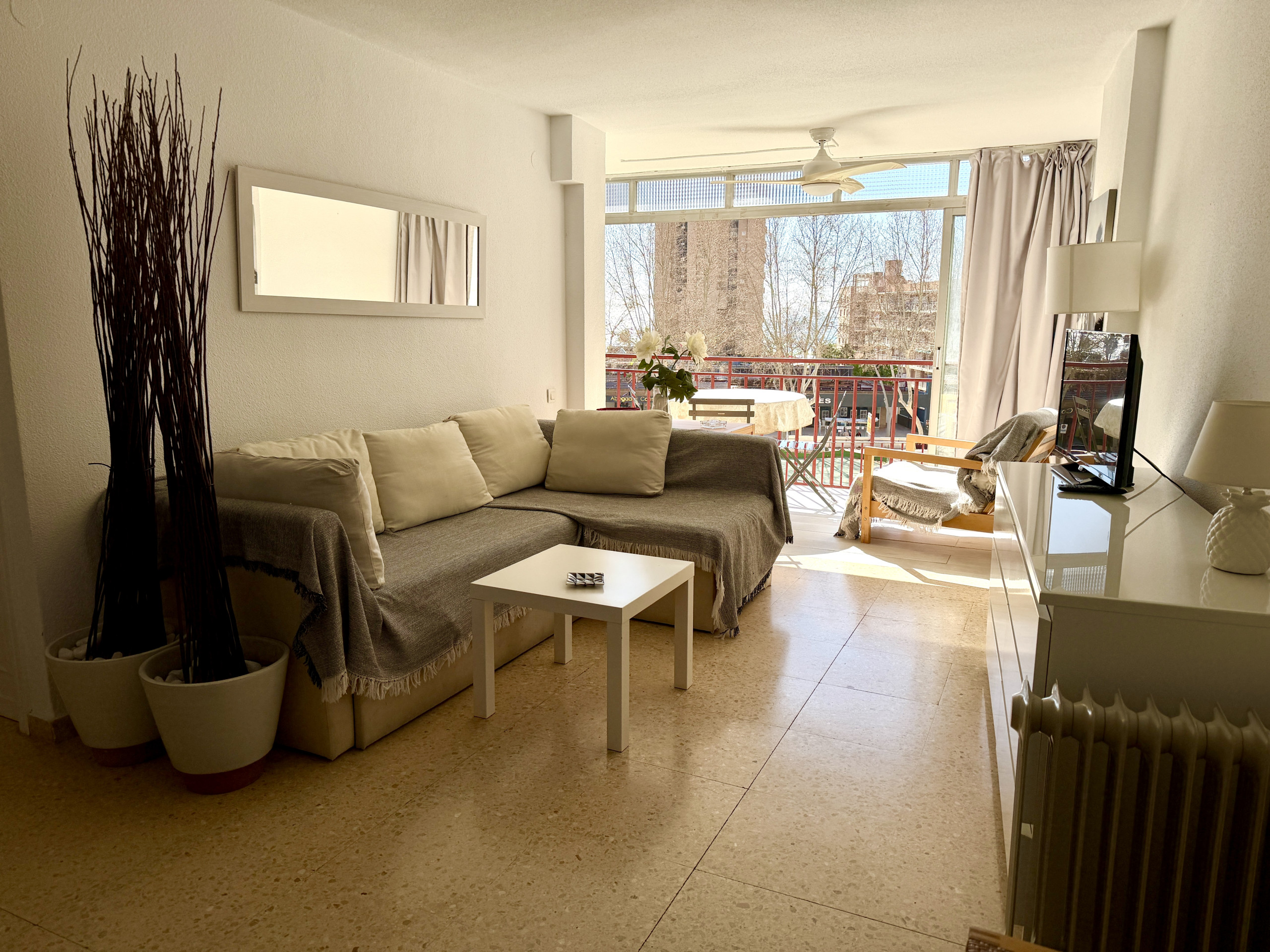 Salón con sofá cama y TV y balcón acristalado con mesa de comedor y ventilador de techo.