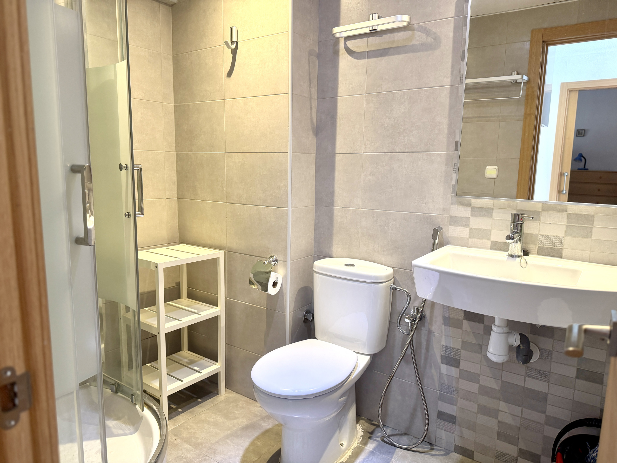 La salle de bain est rénovée et dispose de toilettes et d'une douche.