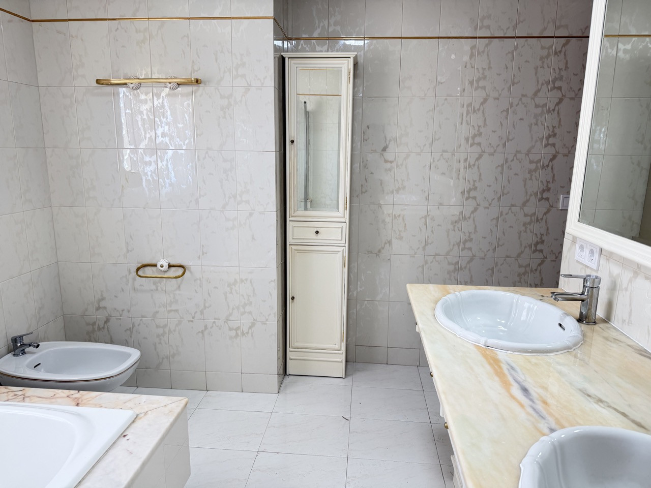 La salle de bains est pourvue d'un bidet et d'une baignoire.