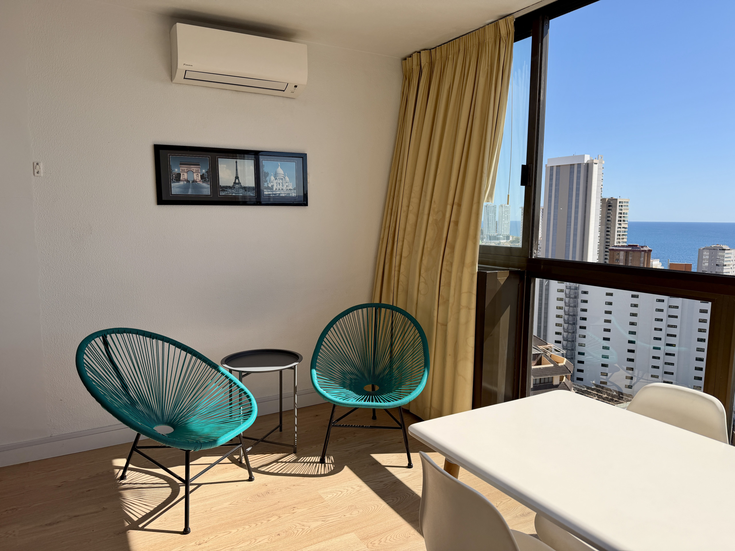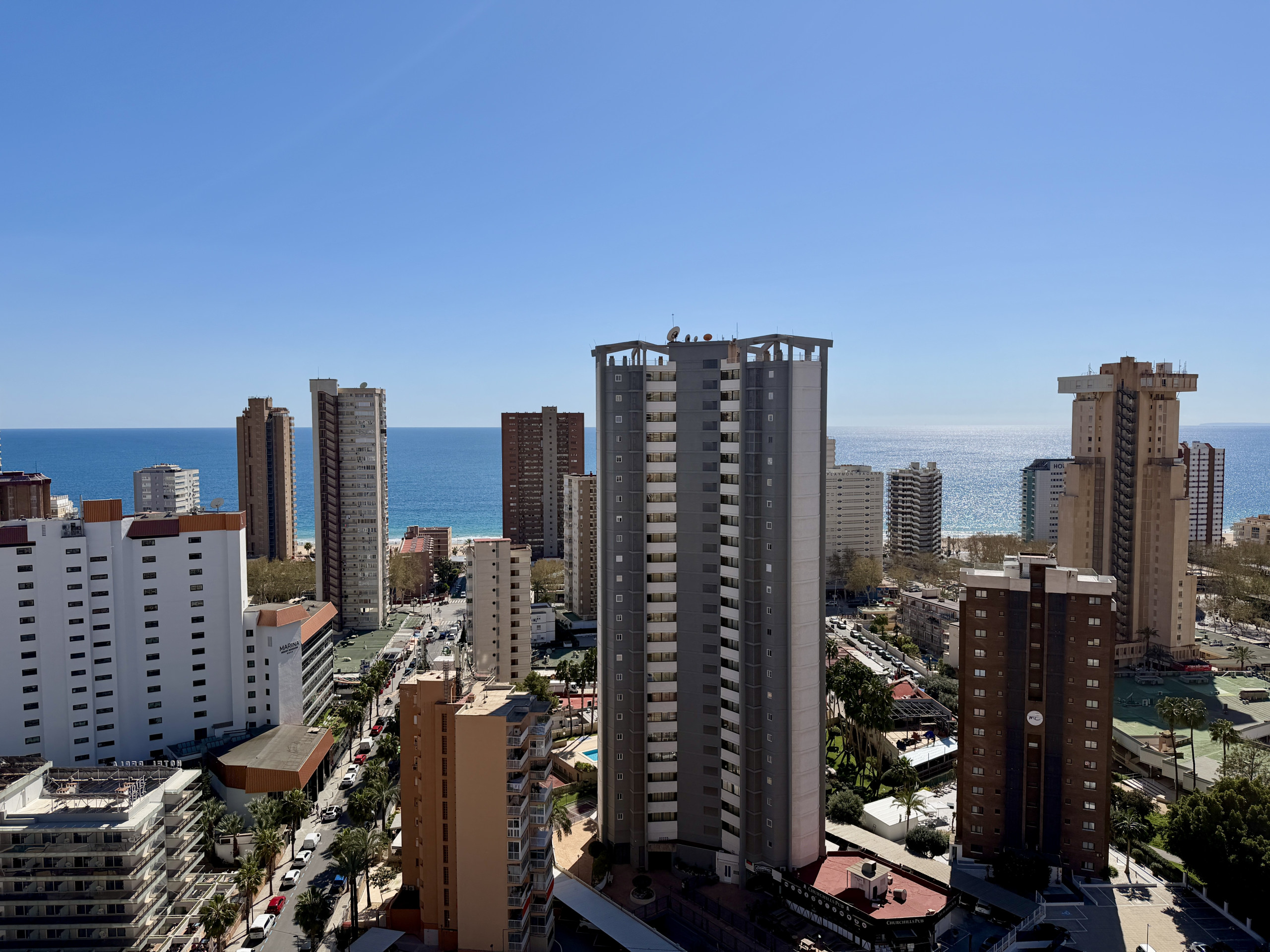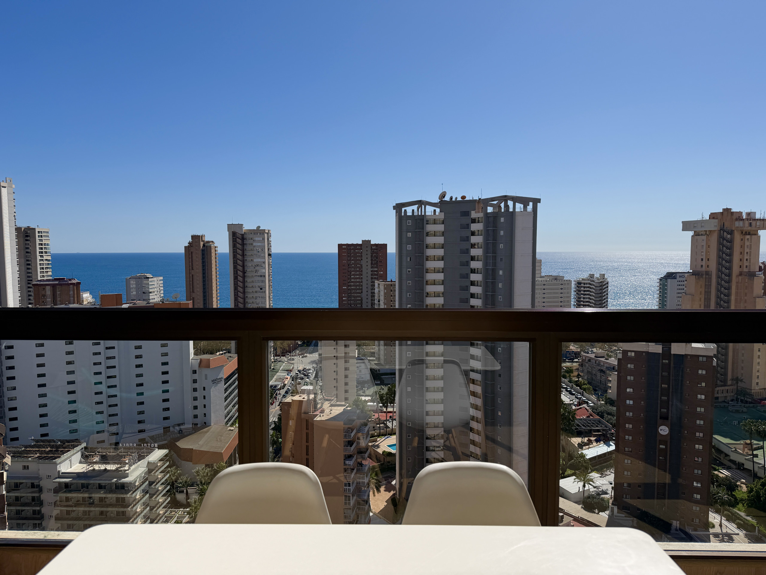 Profitez d'un séjour inoubliable dans ce charmant appartement rénové situé au 20e étage de l'immeuble Gemelos 2, offrant de belles vues sur la plage de Levante et la ville de Benidorm.