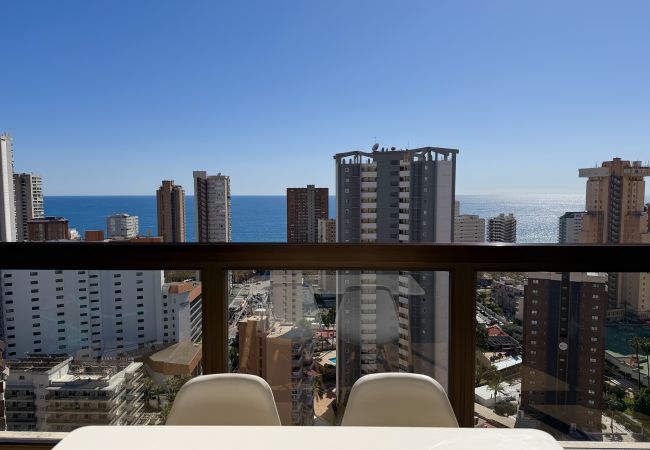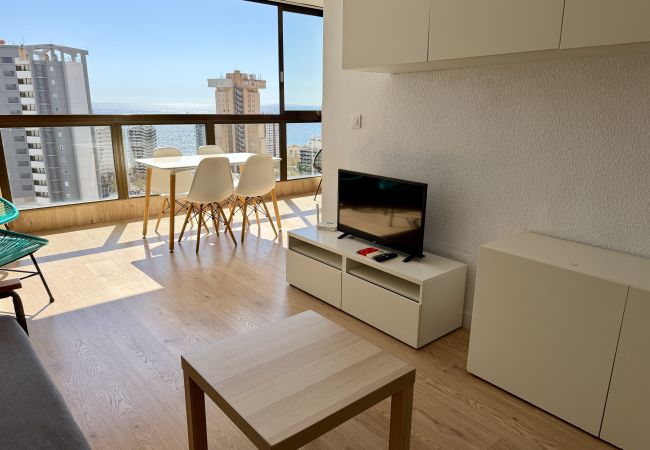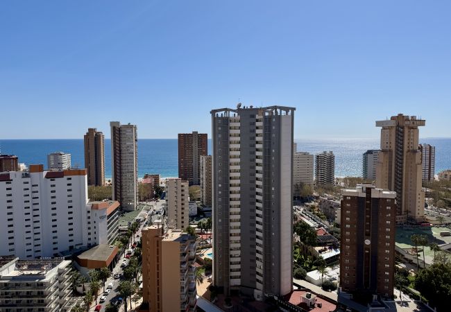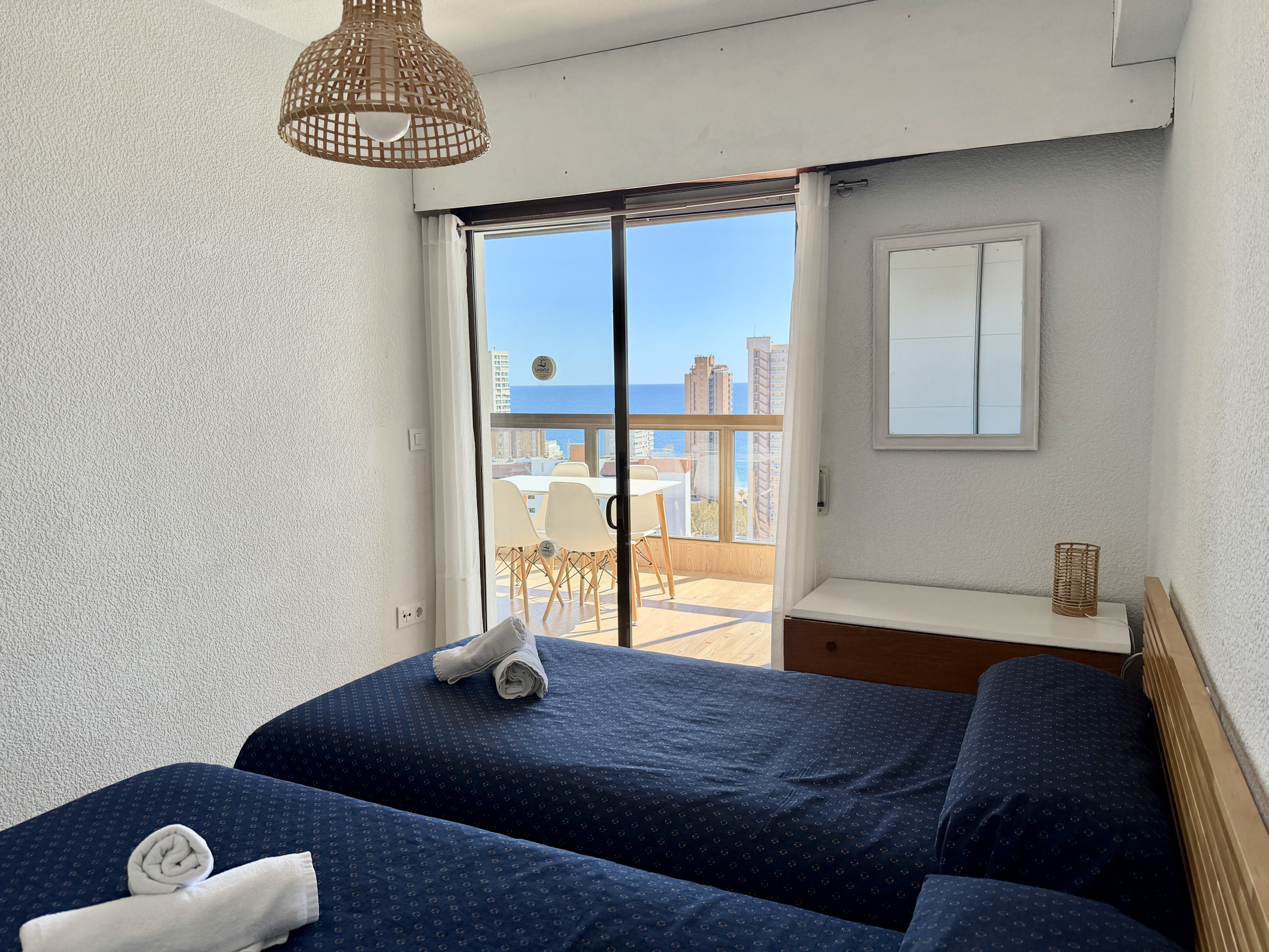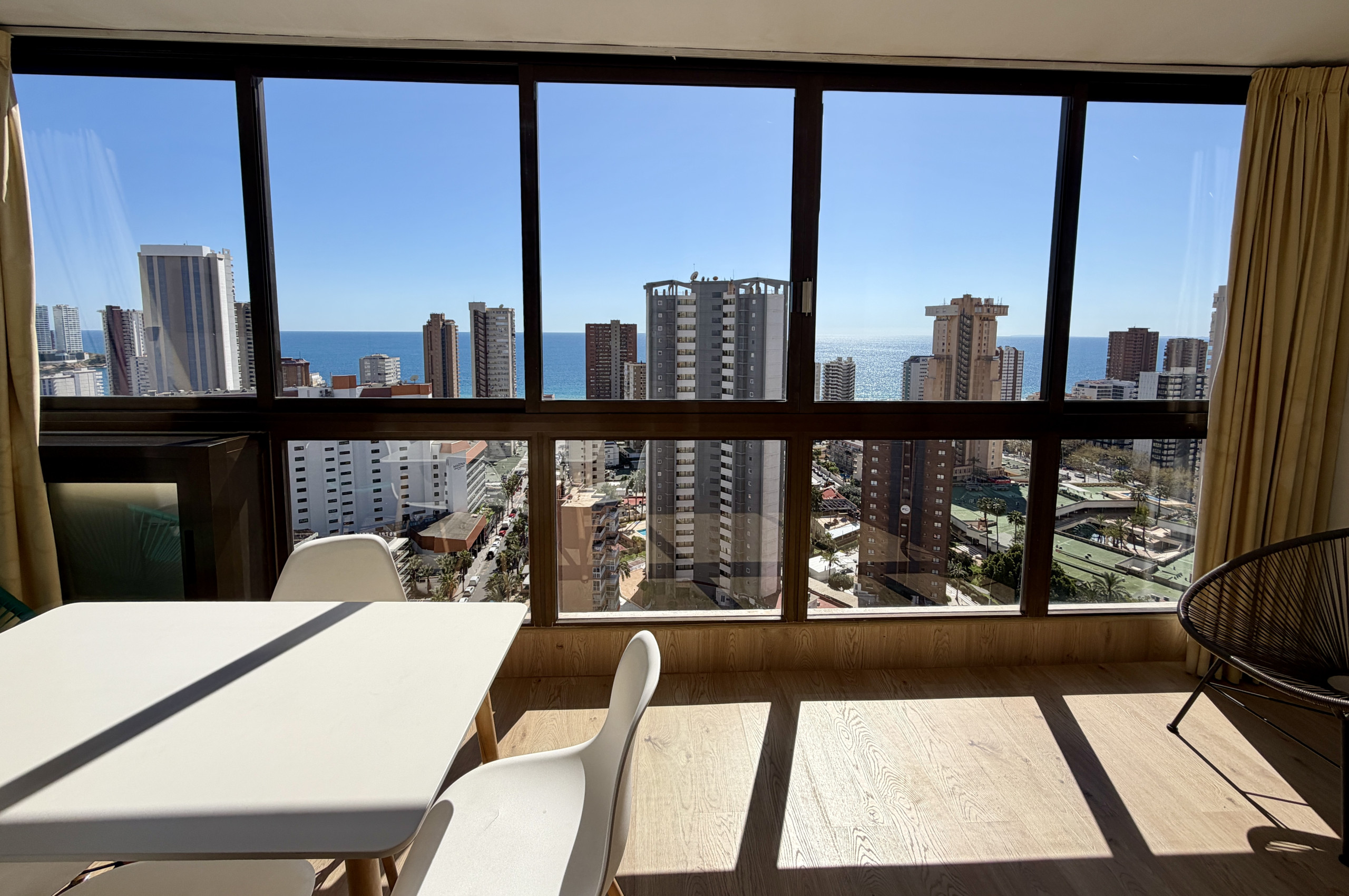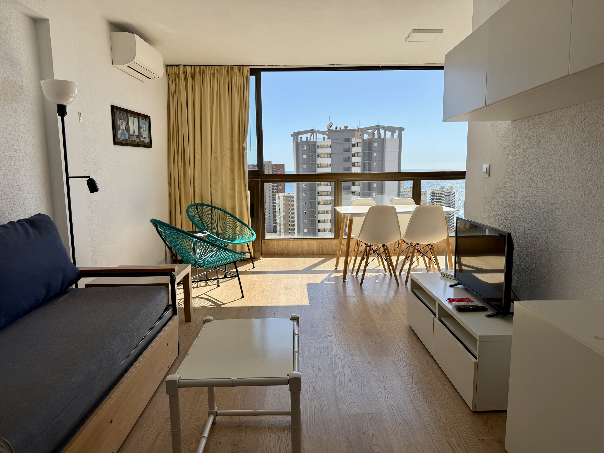 Profitez d'un séjour inoubliable dans ce charmant appartement rénové situé au 20e étage de l'immeuble Gemelos 2, offrant de belles vues sur la plage de Levante et la ville de Benidorm.