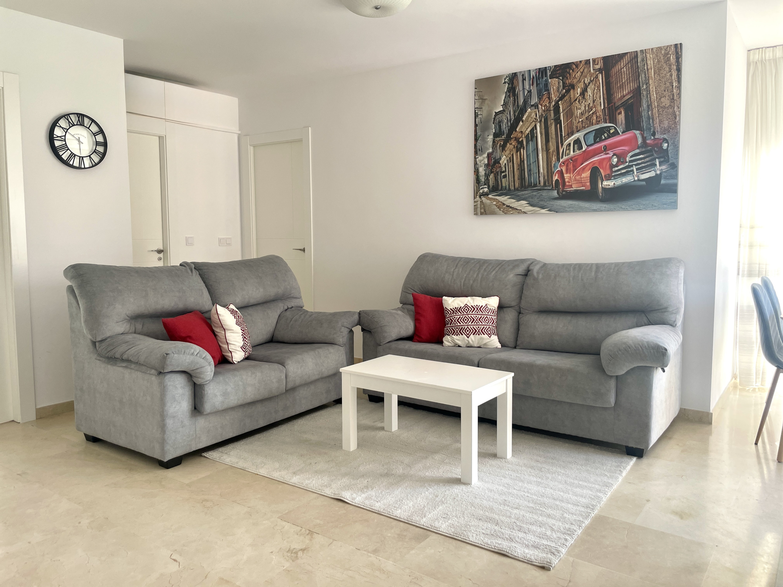 L'appartement se trouve au 2ème étage du bâtiment Viviendas Jardín 2. Il est composé de deux chambres, deux salles de bains, un salon-salle à manger et une cuisine.