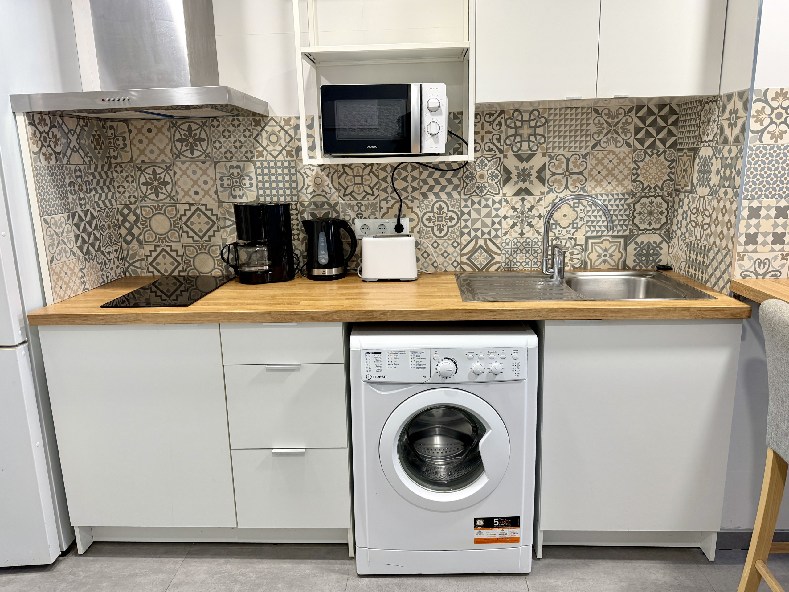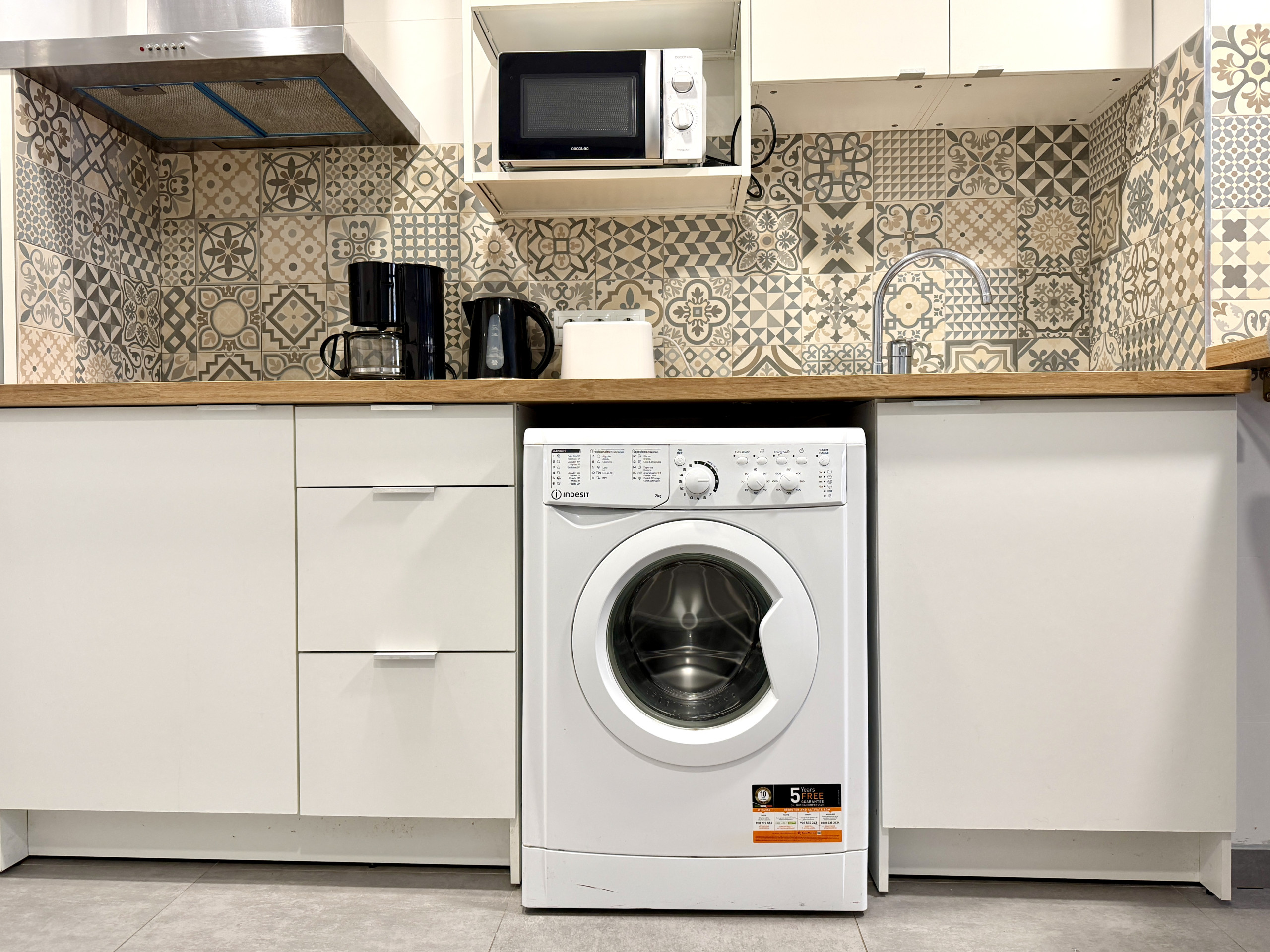 La cuisine dispose d'un bar à petit-déjeuner, équipé de tous les appareils nécessaires : réfrigérateur, micro-ondes, four, plaque vitrocéramique à 4 feux et lave-linge.