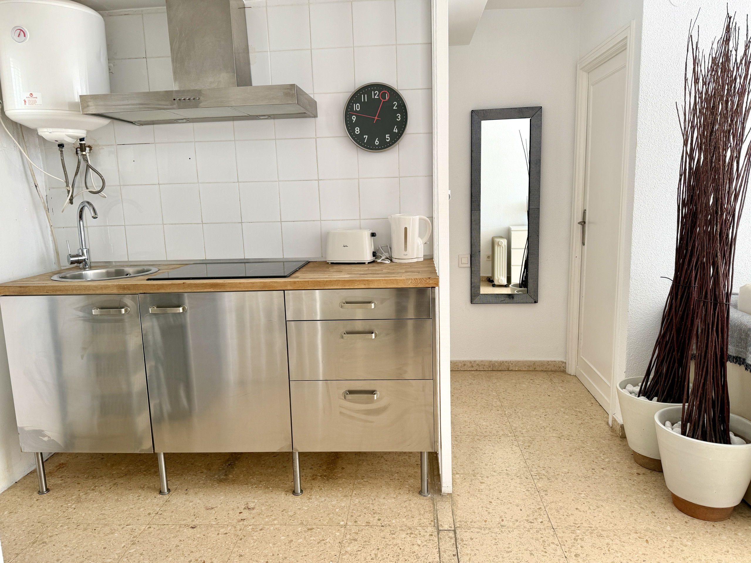 La cuisine est intégrée au salon et est équipée de tous les appareils électroménagers nécessaires : Réfrigérateur, micro-ondes, four, plaque de cuisson 4 feux, cafetière et lave-linge.