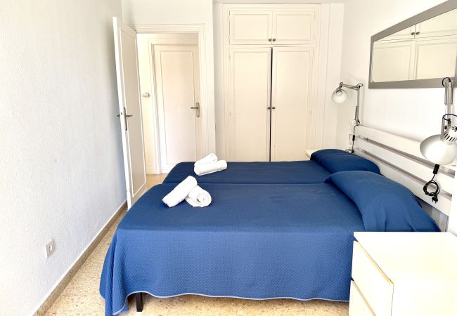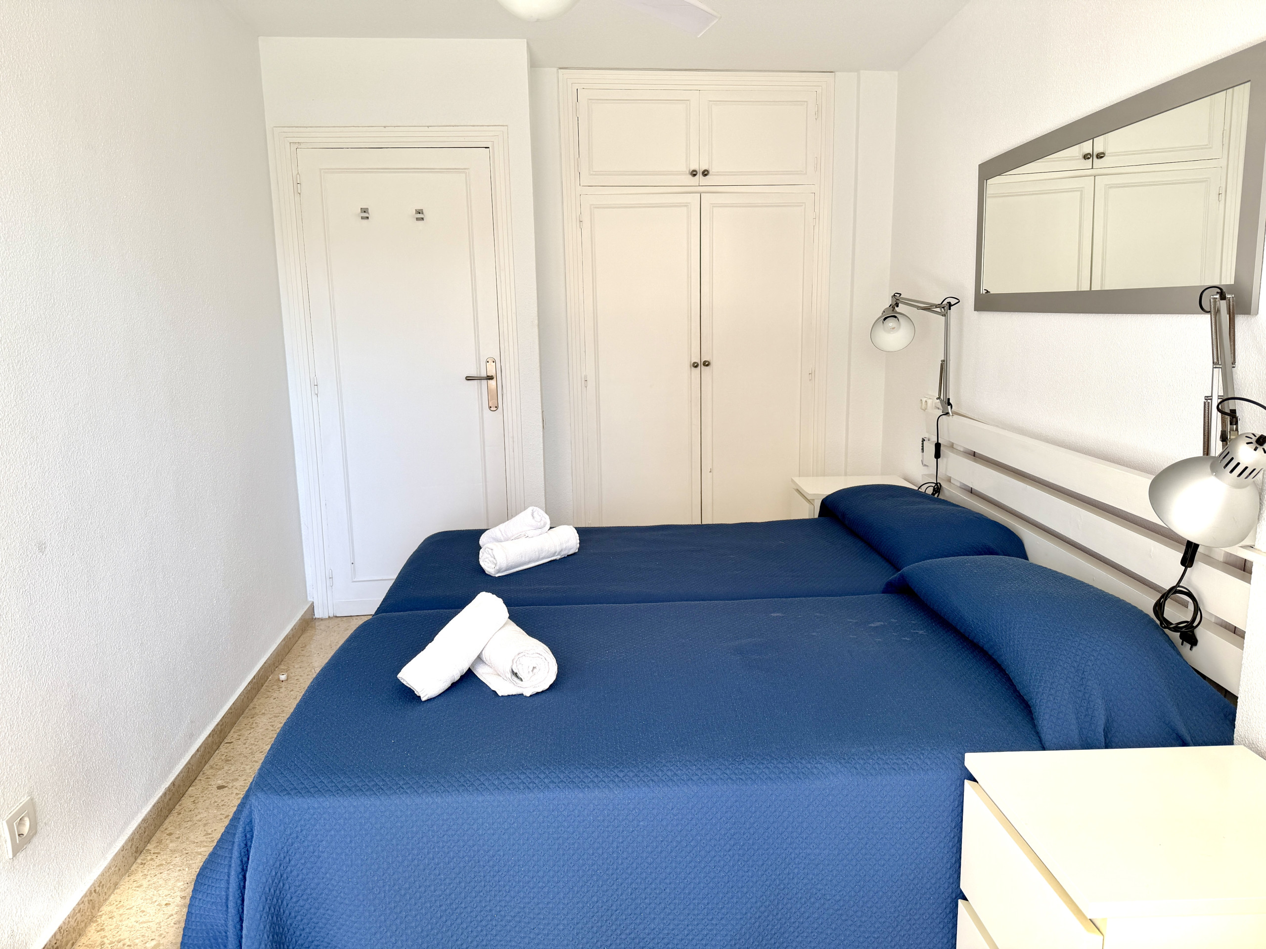 Dispose d'une chambre avec deux lits individuels. La salle de bain est fonctionnelle avec douche et machine à laver. La cuisine communique avec le salon et dispose d'un réfrigérateur, d'une plaque vitrocéramique et d'un micro-ondes. Salon avec Smart TV, wifi et climatisation, et accès à la terrasse vitrée offrant une vue privilégiée sur la mer.