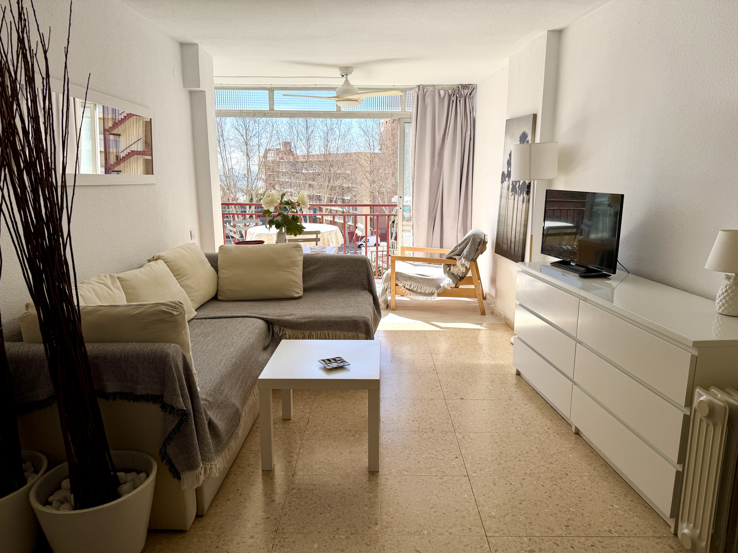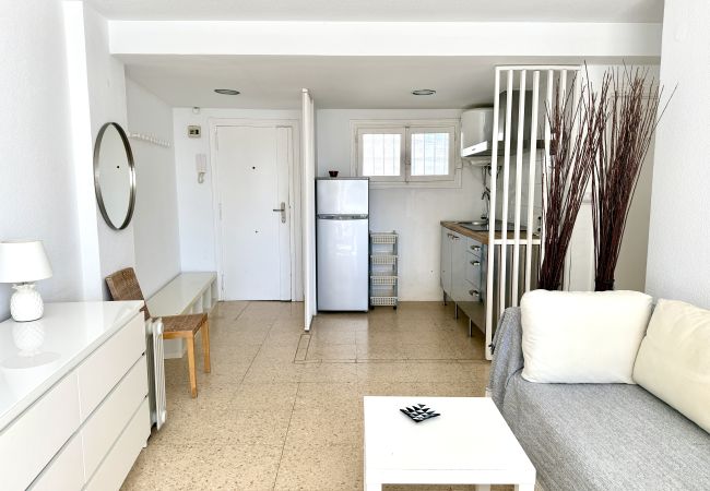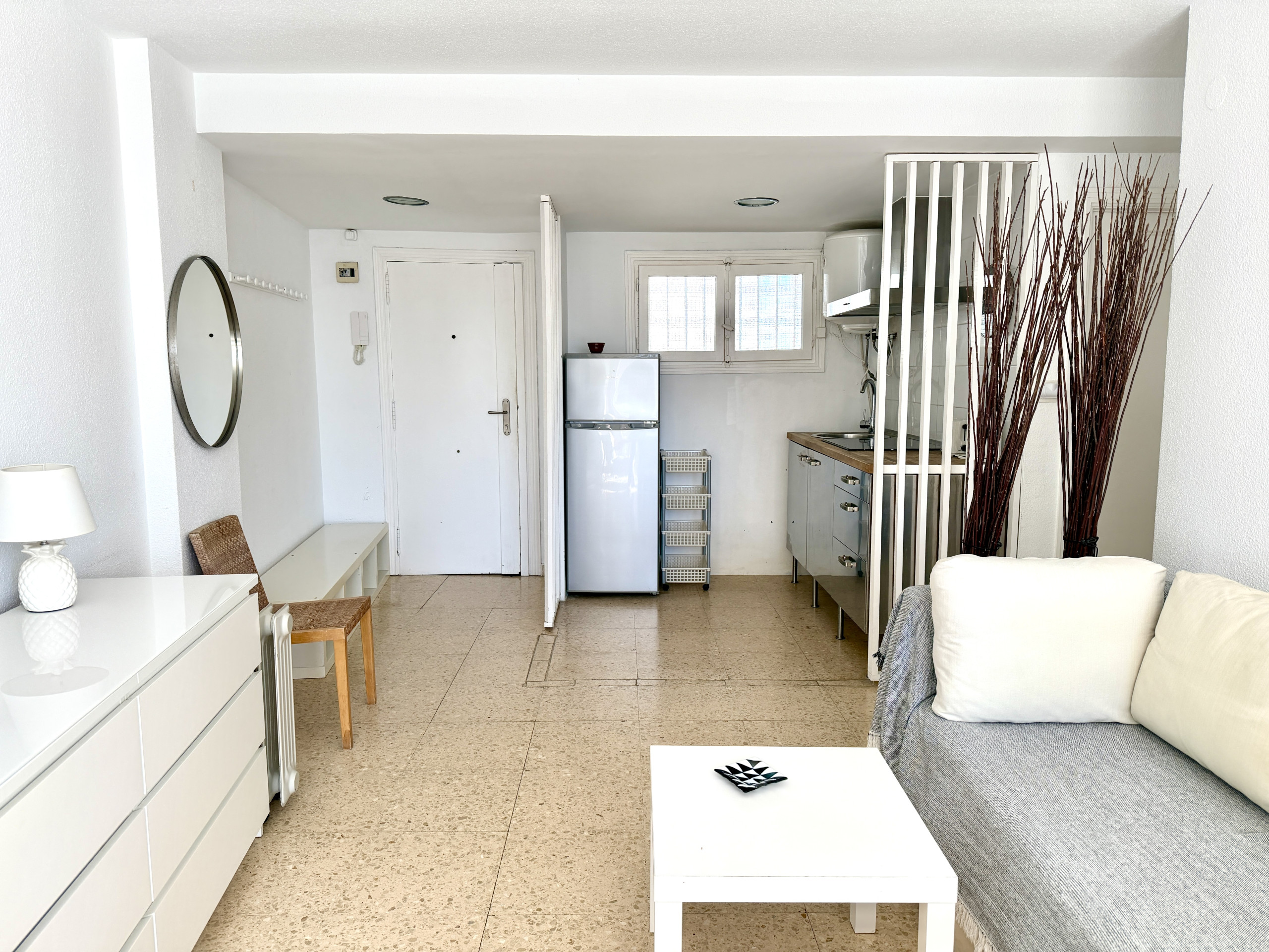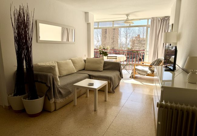 Le salon-salle à manger dispose également de la climatisation, de la TV, du wifi et d'un accès à un petit balcon offrant une vue sur la piscine, la mer et la ville de Benidorm.