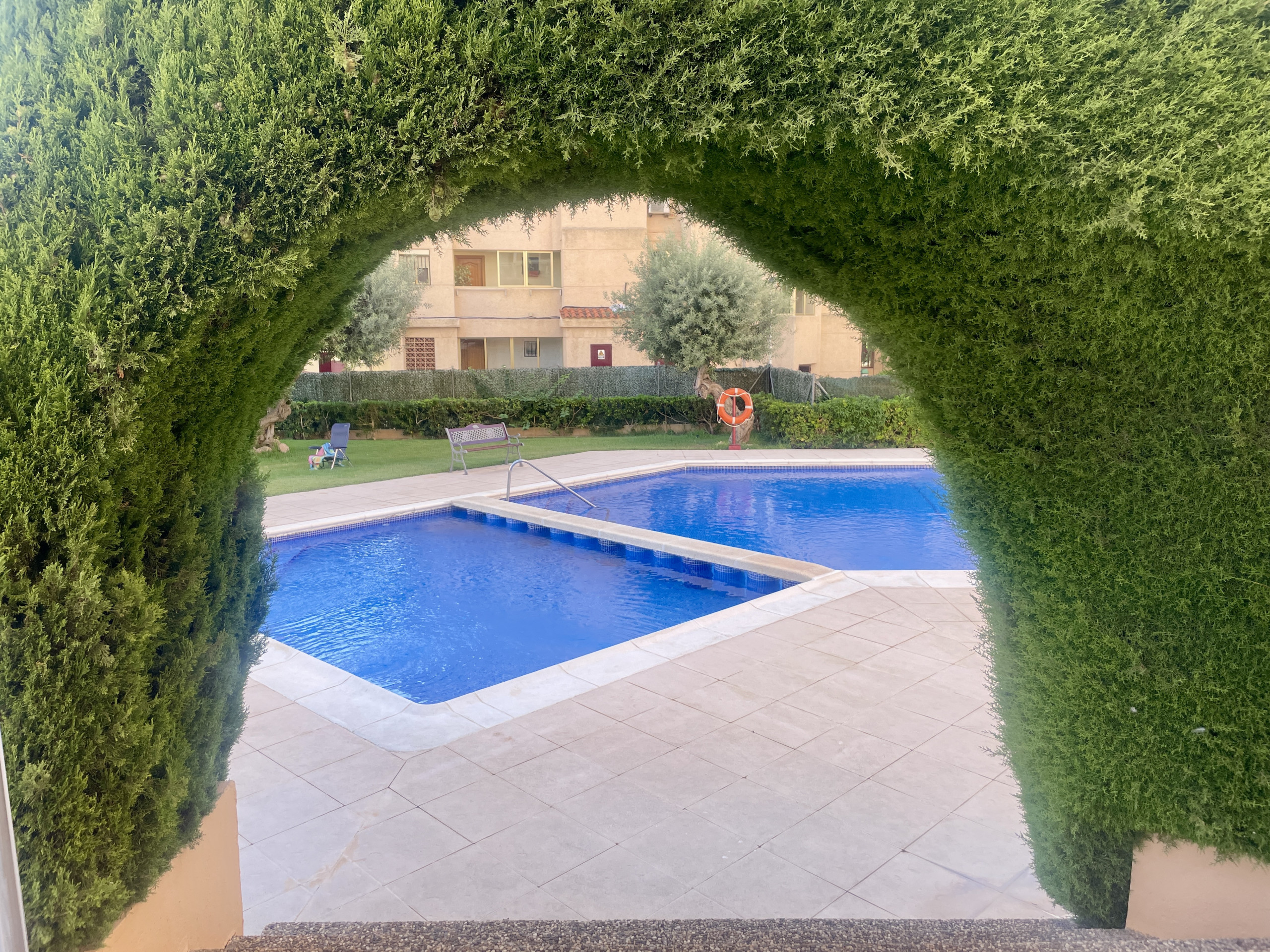 The apartment has a small terrace with views of the pool and garden, the city and partially the sea.