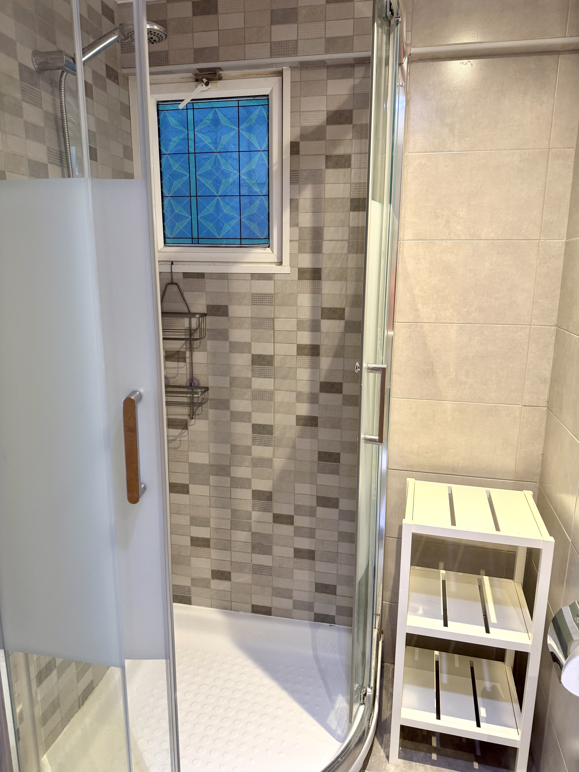 The bathroom has been renovated and has a toilet and shower.