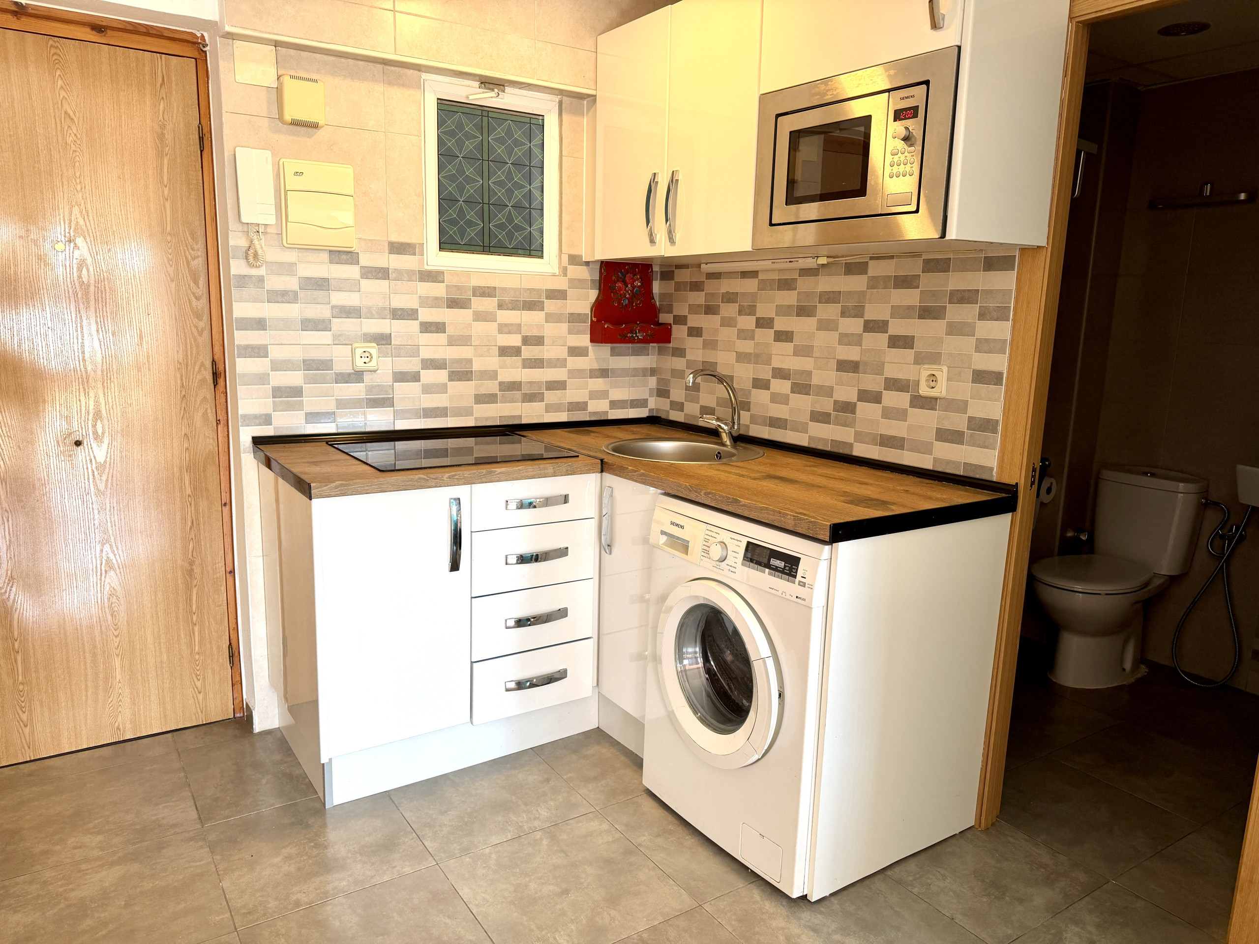 The kitchen is equipped with an oven, microwave, fridge and washing machine.